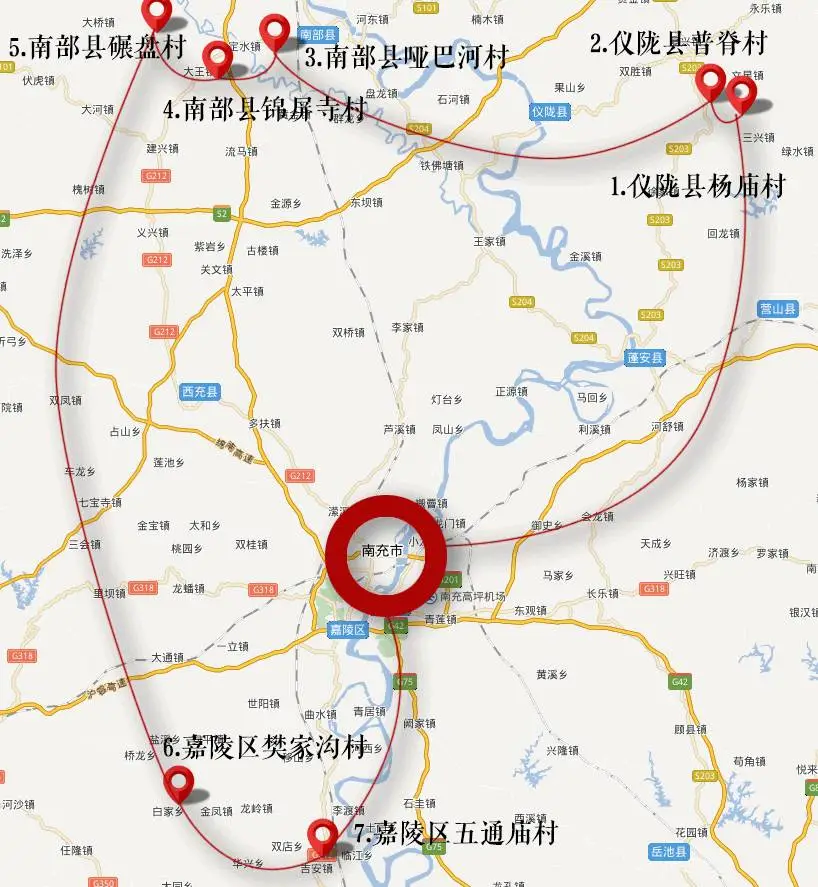 调研从成都出发,我们以南充市为中心,先后前往仪陇县、南部县和嘉陵区,分别考察了仪陇县二道镇杨家庙村、仪陇县二道镇普脊村、南部县凤台乡哑巴河村、南部县蓬安县锦屏寺村、南部县雄狮乡碾盘村、嘉陵区白家乡樊家沟村、嘉陵区吉安镇五通庙村的七个桥点,为了方便大家搞清位置关系,特意画一张简图说明。